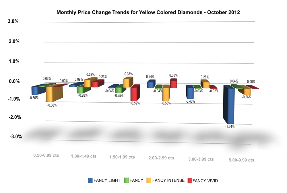 In a report in this issue of the Gem Color Report, the esteemed Wall Street Journal has declared yellow to be the new color of luxury. For our part, in our January, May and July 2012 newsletter, we have been following price trends for yellow colored diamonds, taking periodical looks at how the market has been reacting. Four months after our last examination, we have decided that it would be a good opportunity to follow up on our promise to revisit the issue.