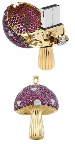 The price, of course, depends on the gemstones and the precious metal in which it is set. So a Magic Mushroom USB key in white gold, emeralds and diamonds will cost $36,900, while the USB key in yellow gold, white diamonds and rubies costs, $24,400. The USB key in pink gold with pink sapphires and white diamonds is a steal at $16,500.