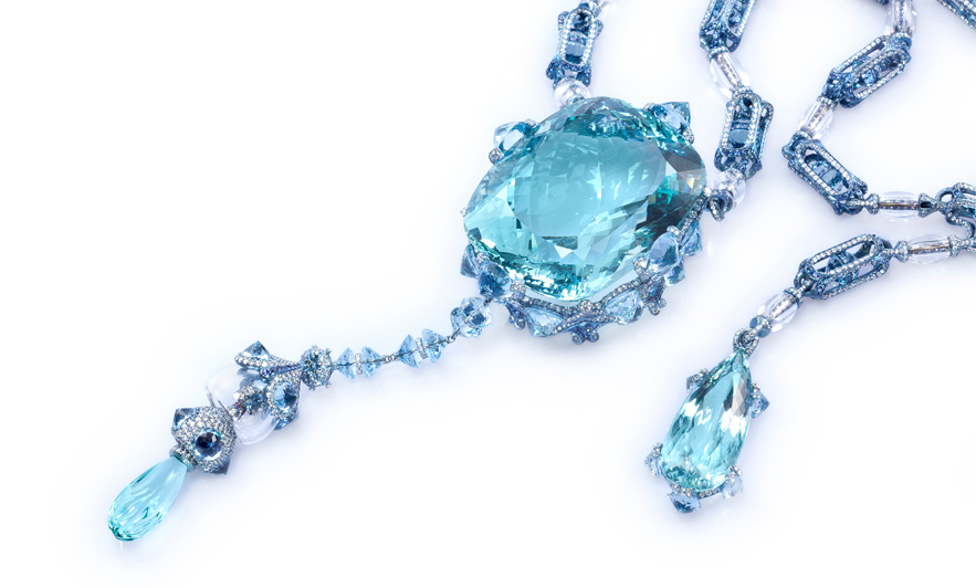 Another piece created for the Biennale is an aquamarine necklace, called "A Drop in the Ocean" featuring a 379.21-ct. aquamarine, which is said to have been inspired by a mermaid's tear. Other stones include diamonds and sapphires.