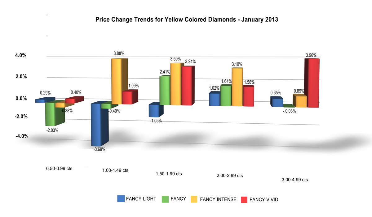 The only exception to the rule of stable prices across the board mentioned above was in the category of the 5.00-9.99-ct. Fancy Light Yellow diamonds. This category showed a steeper, although not dramatic, decline of 1.54%. But in stones of these sizes it could mean up to hundreds of dollars differences in price.