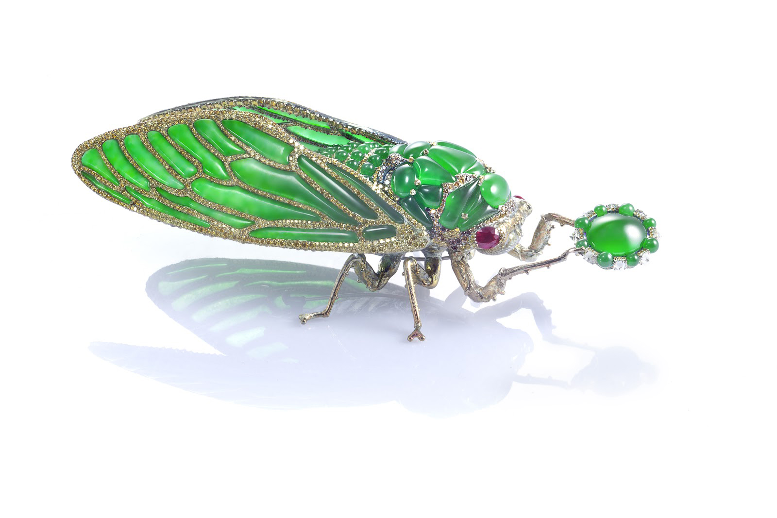As the first and only Chinese artist ever invited to showcase his designs at the Biennale des Antiquaires, Chan created a number of items especially for the prestigious event. Among them is a brooch called "Stilled Life on the theme of cicada and Zen." Representing a cicada, which is a grasshopper-like insect that is common in Southeast Asia, it is made of imperial jadeite, with rubies and diamonds.
